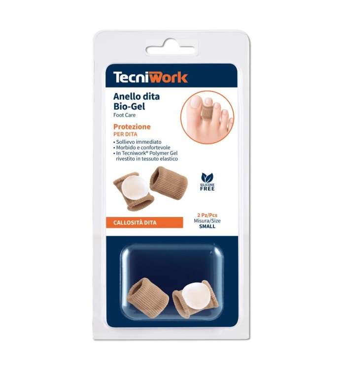 anello per dita in tessuto elastico con cuscinetto interno in morbido Tecniwork Polymer Gel. L'olio minerale rilasciato gradualmente dal gel effettua un'azione emolliente sulla pelle e sulle callosità facilitandone la rimozione. Procura una immediata sensazione di sollievo per la sua gradevole morbidezza e funzione protettiva.